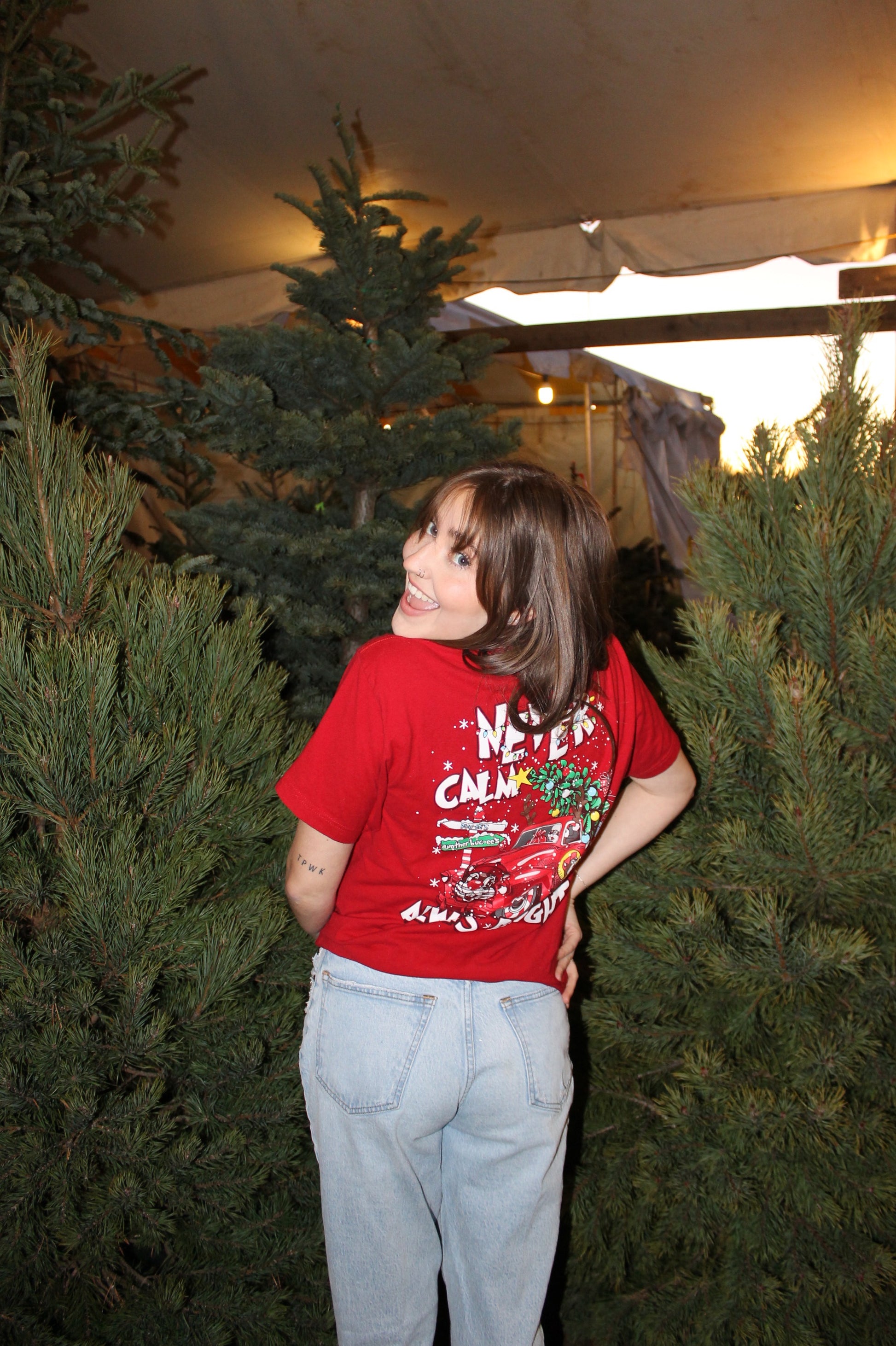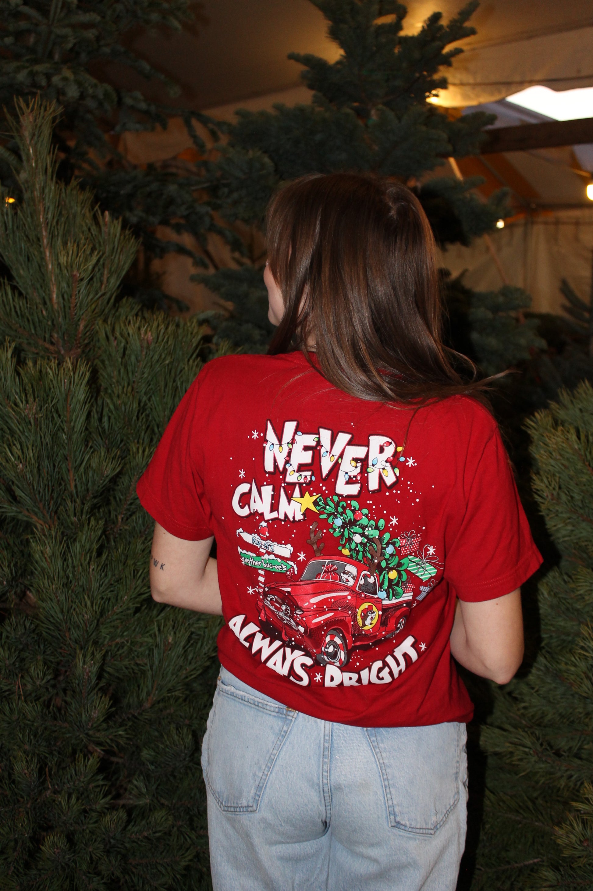 on the back, this tee shows a red pickup truck hauling a Christmas tree, with Buccee driving, and the inscription "never calm, always bright".