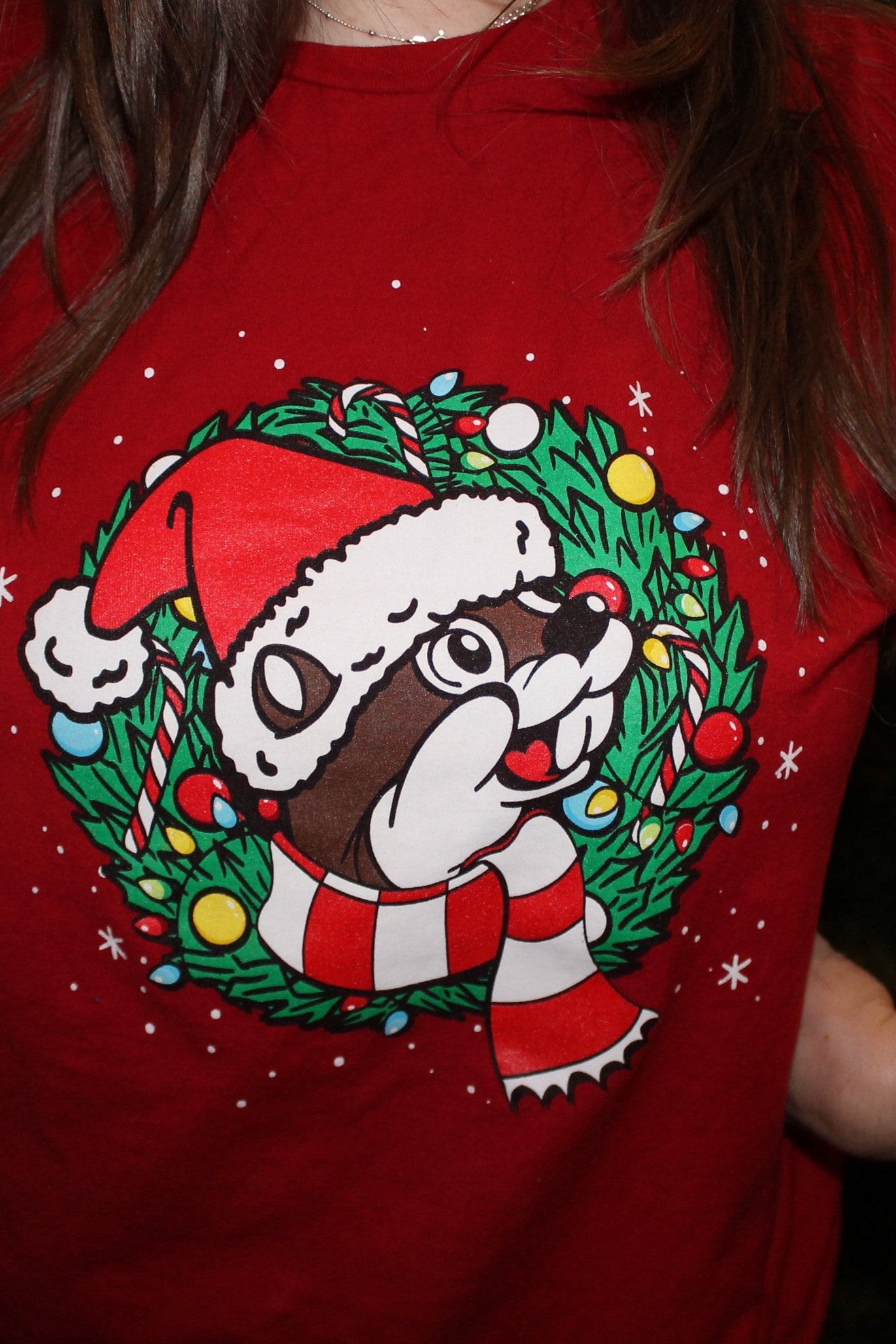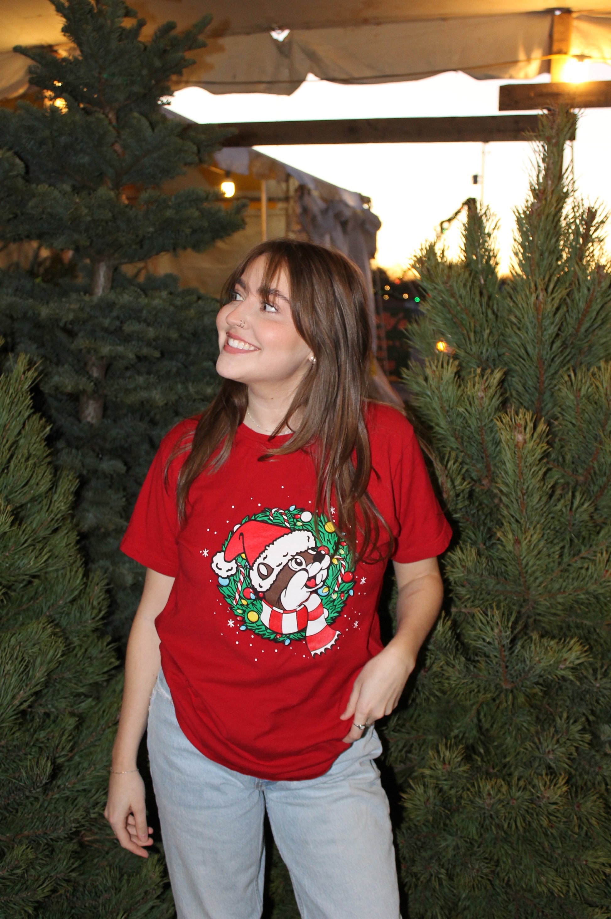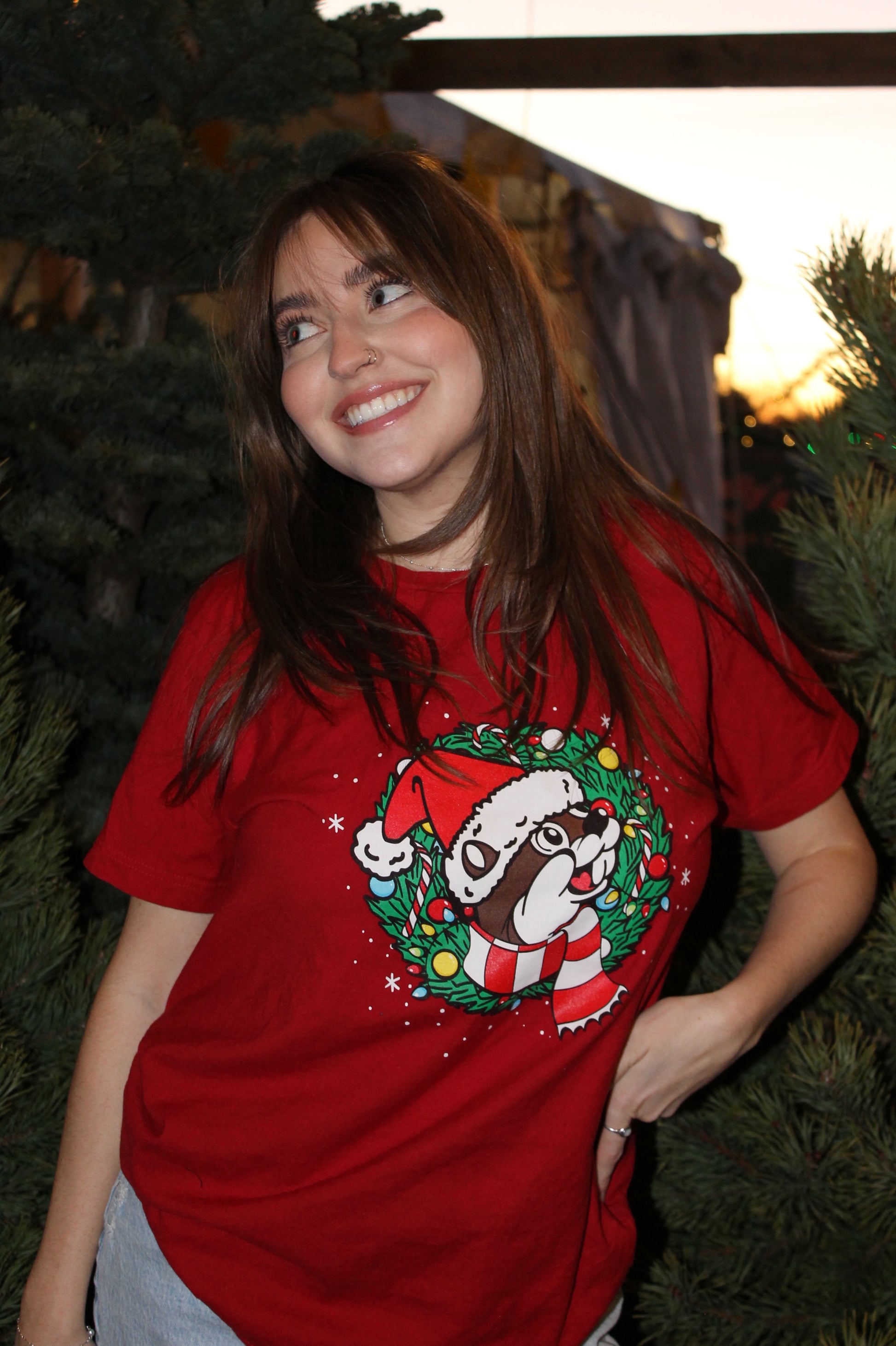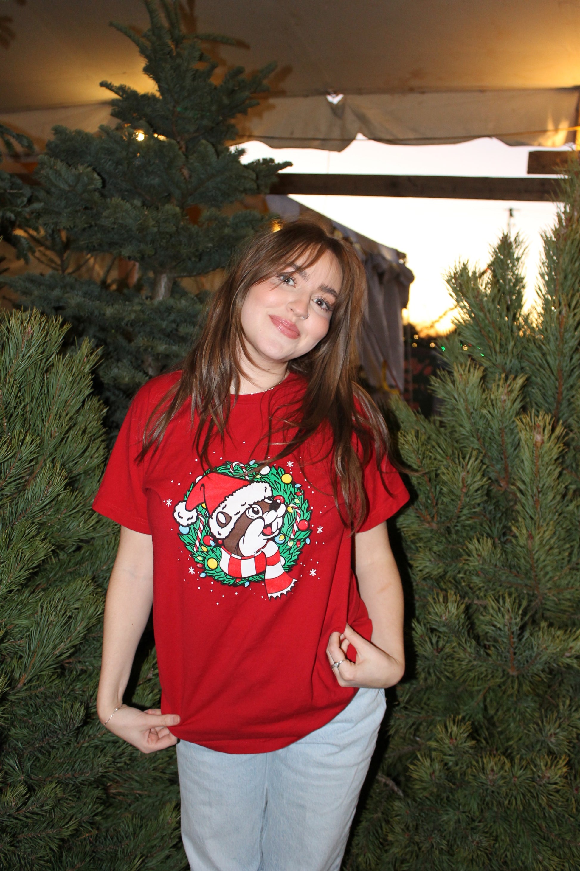 get ready for a "beaver"-ly festive holiday with our "pit stop" tee featuring Buccee's famous mascot, Buccee the Beaver, adorned in a Christmas wreath.